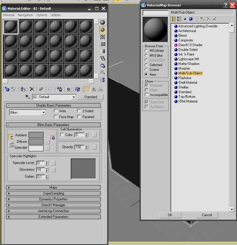 - Select a fresh material, click on the “Standard” slot and change the material type to “Multi/Sub-Object”