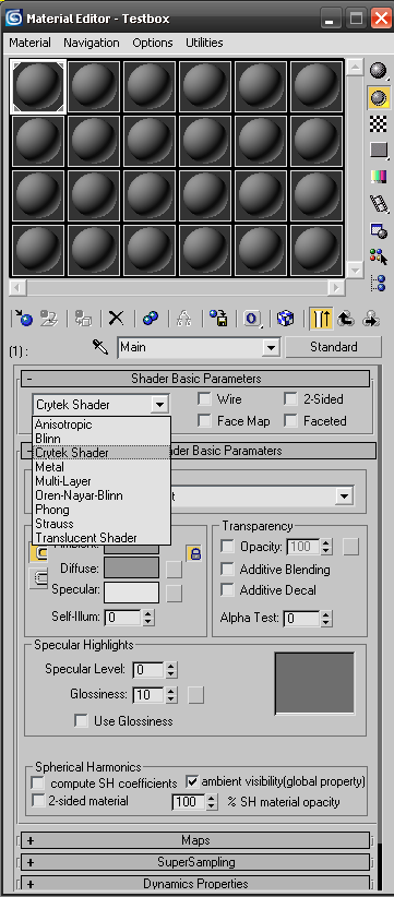 - Open each submaterial and in the “Shader Basic Parameters” rollout change the shader type to “Crytek Shader”. You should only use Crytek Shader for your objects. The other shader types will not work correctly when exported. If you have troubles here, please check that your plugins are all installed correctly.