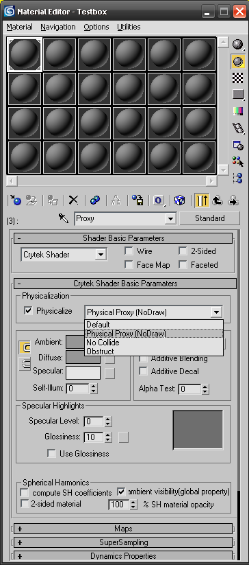 You’ll notice a new dropdown list under “Physicalization”. This list contains presets for the way the material acts in the engine. For now, we only worry about two of these; Default and Physical Proxy.