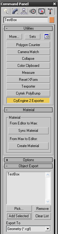 - Open the CryENGINE®2 Exporter Utility. It’s a good idea to add a button for the exporter to the utility button list if you’re going to use it a lot.