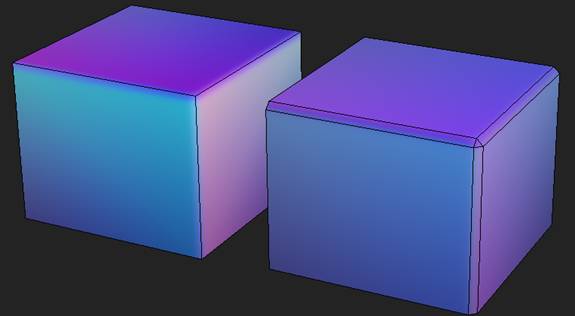 Low poly meshes with their corresponding normal maps in 3dsMax: No chamfer - left, two-segment chamfer - right.
