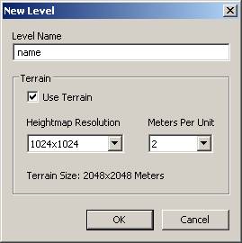 Creates a new level. You need to specify a level name and choose if the level should have a heightmap (Use Terrain) or not.